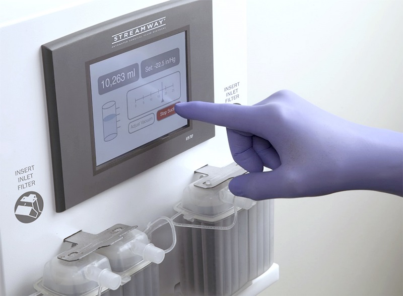 The Streamway® system is a fully automated surgical waste management system that disposes of an unlimited amount of suctioned fluid, providing uninterrupted performance for surgeons while decreasing healthcare workers’ exposure to potentially infectious fluids found in the surgical environment. The Streamway system installs in or on the wall with direct-to-drain fluid removal for safe, continuous collection and disposal.